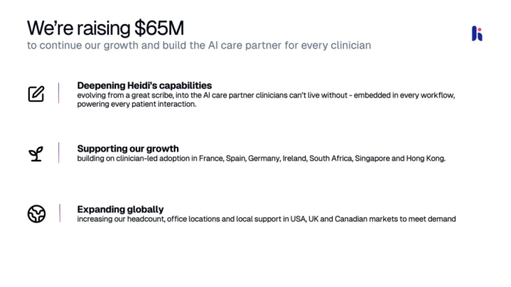HeidiHealth还在建立显著的国际影响力,在116个国家拥有医生用户。相比之下,同行Abridge和Ambience只在北美销售他们的技术。这种全球化策略不仅降低了对单一市场的依赖,也打开了美国竞争对手经常忽视的大型可触及机会。Kelly博士说,公司计划利用B轮融资扩大办公地点并加速招聘,特别是在美国、英国和加拿大,同时深入那些临床医生已经开始使用Heidi产品的市场,如法国、南非、新加坡和香港。在英国,每两个全科医生中就有一个每周使用Heidi。这种自然增长证明了产品的价值,也为未来的企业级扩张打下了坚实基础。