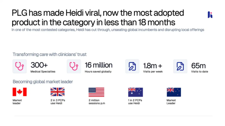Kelly博士找到了曾在之前创业公司共事的技术合伙人WaleedMussa,两人一起开始构建这个解决方案。2024年初,HeidiHealth开始正式推出产品。从那时起到现在,短短18个月内,公司经历了爆炸式增长。现在,HeidiHealth每周支持超过200万次临床咨询,覆盖110种语言和116个国家。这种增长速度在医疗技术领域是罕见的,甚至让投资人Blackbird将其描述为”投资组合中增长最快的公司之一,增长速度可与类似阶段的Canva等定义品类的企业相媲美”。
